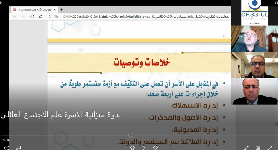 عرض الأستاذ الجامعي ورئيس المركز الاستشاري للدراسات والتوثيق مداخلته بعنوان "انعكاسات الأزمة الاقتصادية والنقدية على اقتصاديات الأسرة في لبنان، العوامل والمؤشرات وسبل الوقاية" متناولاً المدخل إلى الأزمة بوصفها متعدّدة العناصر، وتشمل الأزمات الاقتصادية والنقدية، والأزمات المصرفية والعقارية، والأزمات المالية العامّة، وهذا بحسب فضل الله نادر الحدوث في الدول التي تمر بأزمات. وتطرّق إلى "مؤشّرات الأزمة من خلال انخفاض حاد في الناتج المحلّي الإجمالي، وتدهور في سعر صرف الليرة اللبنانية، وانخفاض في سعر الصرف الحقيقي، والانكماش الاقتصادي، وارتفاع في معدّلات التضخّم الذي لامس عتبات التضخّم المفرط، وارتفاع معدّلات البطالة، وتراجع التوظيف بسبب الأزمة وجائحة كورونا".
