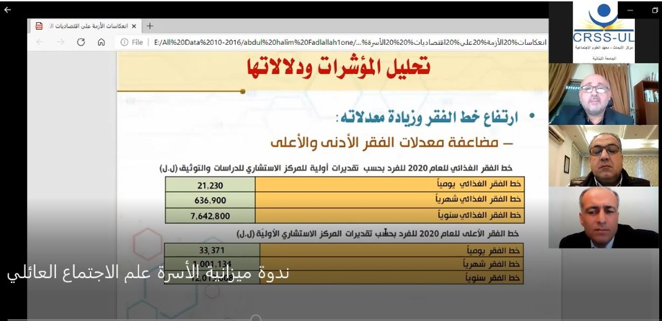 بينما تمحور تحليل المؤشّرات حول ارتفاع خط الفقر وزيادة معدّلاته، وتأثير إيقاف دعم سعر صرف السلع الأساسية، ورأى الدكتور عبد الحليم " في أسباب الأزمة وأبعادها ثلاثة عناصر، أوّلاً افتعال القدرة الشرائية بتكاليف باهظة من خلال دعم سعر صرف لليرة اللبنانية المثبّت، وثانيًا: الانفصال بين الاقتصاد المالي والاقتصاد الحقيقي، وثالثًا: نمو الاستهلاك بأعلى من نمو الناتج، ورابعًا: النظر إلى الاستهلاك على أنّه من محرّكات النمو". وفي الخلاصة والتوصيات، اعتبر فضل الله، أنّه يجب على الأسر أن تتكيّف مع أزمة ستستمر طويلاً من خلال إجراءات تتوزّع وفق أربعة صعد: إدارة الاستهلاك، وإدارة الأصول والمدّخرات، وإدارة المديونية، وإدارة العلاقة بين المجتمع والدولة. لافتاً أنّه لا يمكن للأسر من الناحية الواقعية استيعاب نتائج الأزمة من دون دعم قوي من الدولة وبرامج سريعة للإنقاذ والتعافي، مشيراً إلى أنّ ترك الأسر لمصيرها سيُقوّي تيّار الهجرة بمداخيل منخفضة، وسيلحق الضرر بالرأسمال الاجتماعي الذي جرت مراكمته عبر مدّة زمنية طويلة، كما أنّه سيُعزّز ظاهرة الاستبعاد الاجتماعي، وأكّد فضل الله على دور الدولة في هذه المرحلة الانتقالية للحؤول دون تآكل هذا الرصيد.