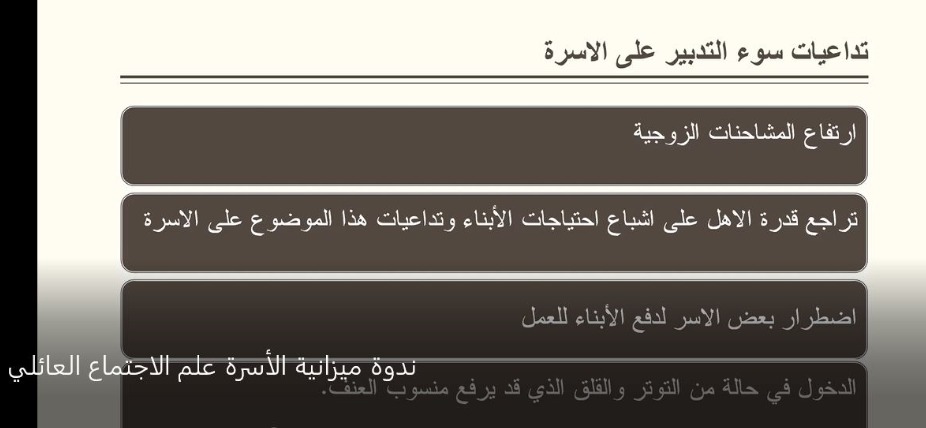 وبيّن دكتور عمر أسباب اختلال الإدارة المالية للأسرة في الأحوال العادية من خلال زيادة النفقات عن المداخيل لأسباب عديدة في ظل الأزمة الحالية، وتدهور سعر الصرف، والتضخم المالي، وحجز أموال المودعين بالقوّة وليس كابيتول كونترول، إضافة إلى جشع التجار، وفشل دعم الأسر. واستعرض "نتائج اختلال الإدارة المالية للأسرة، من خلال عجز في تحقيق الرفاهية وفي تلبية بعض الحاجات الأساسية. وهو أمر ينتج عنه مشكلات نفسية واجتماعية، ومشكلات أسرية قد تؤدّي إلى الطلاق، ناهيك عن الجنوح نحو طرق غير مشروعة تهدّد الأمن الاجتماعي أساس الأمن القومي". وتطرّق إلى قواعد تحديد موازنة الأسرة، ومنها قاعدة المدّة الزمنية، وقاعدة التوازن بين الإيرادات والنفقات بقدر الاستطاعة، وقاعدة الواقعية عند تقدير إيرادات ونفقات البيت، وقاعدة المرونة وإمكانية التعديل في بنود النفقات، وذلك من خلال مؤشرات عامّة، ومصادر تمويل موازنات الأسر، المتمثّلة في مداخيل الأسر، وشرائح مداخيل الأسر، ومكوّنات سلّة الاستهلاك، واختتم عرضه بالإشارة إلى ضرورة وأهمية اعتماد "الاقتصاد التكافلي".